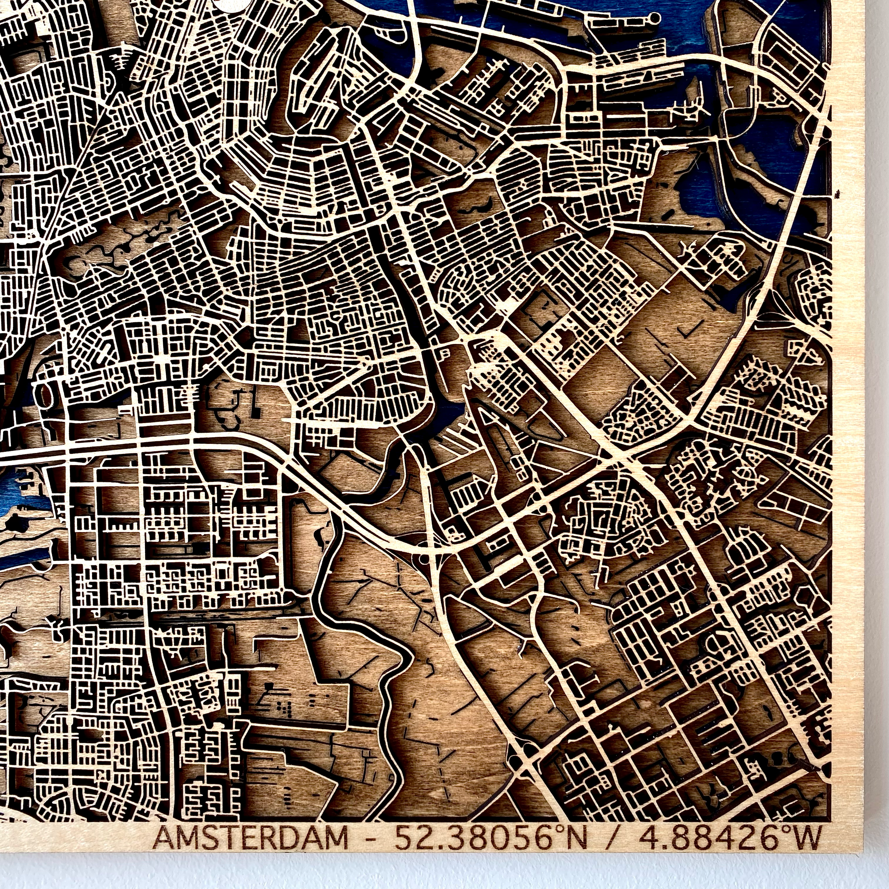 Every map is made up of three distinct layers, each laser-cut with 0.1mm precision to capture every curve, coastline, and contour: